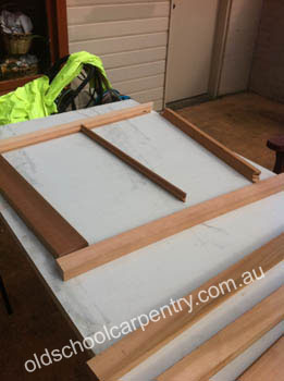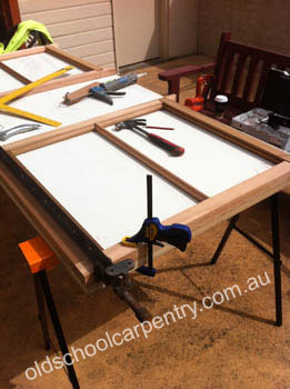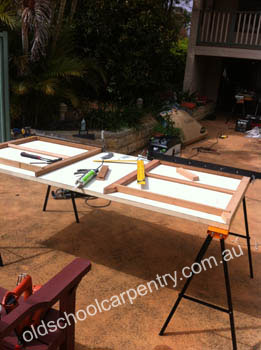 A few other replacement sash windows drying, prior to sanding priming and glazing. Our modern adhesive has an incredibly strong and fast set, which makes creating a completely new sash window possible in just one day!